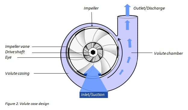 El diseño de la carcasa o voluta transforma la velocidad del agua en presión. - Salida del fluido